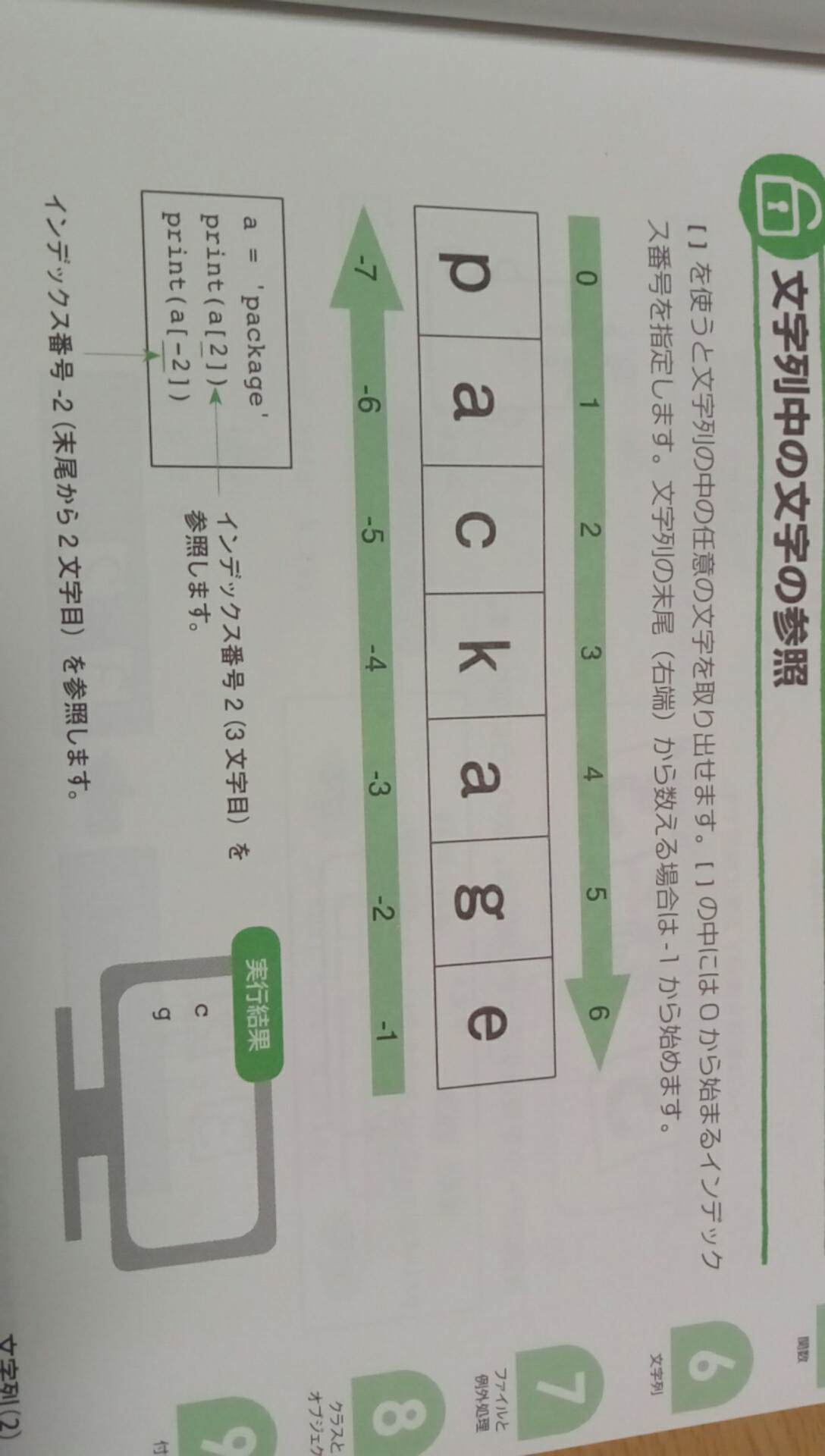 []を使うと文字列の中の任意の文字を取り出せます。[]の中にはゼロ(0)から始まるインデックス番号を指定します。文字列の末尾(右端)から数える場合は、-1から始めます。